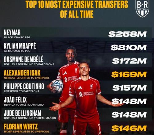 今年夏天,利物浦在转会市场上摇身一变为“金融巨鳄”。红军疯狂撒钱,砸1.45亿欧签下伊萨克,砸1.25亿欧签下维尔茨,这两人的转会费均打破了英超此前的引援转会费纪录。外界惊呼英超要提前大结局了。