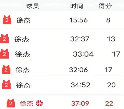 我们看到有媒体发出徐杰本赛季的出场情况,前六场分别为15、32、33、32、34、37分钟,场均高达30.5分钟。球迷们应该记得徐杰首场比赛是受伤了,所以才打15分钟,之后的比赛都是30分钟以上。